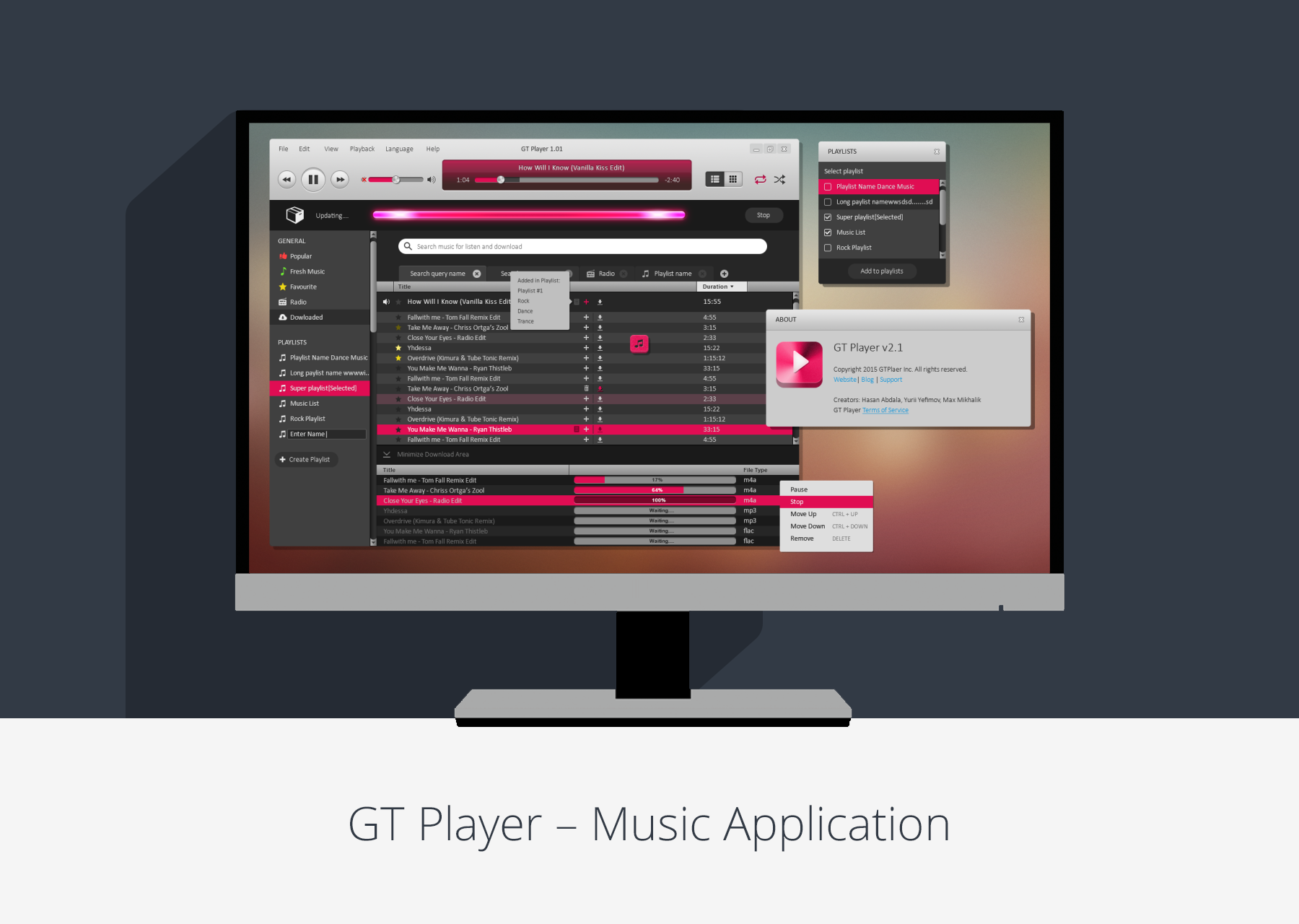 GT Player is a music application – music player, developed for Windows. In this instance our client wanted a modern and multifunctional music application that will correspond to the demands of the young generation, as well all other groups of users. Thus, we were tasked not only with creating visually pleasing music application, but also one that accommodates a lot of functions.